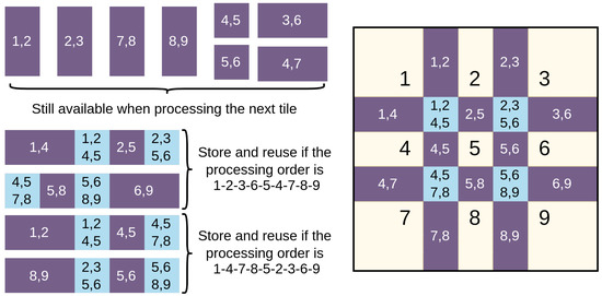 The problem of recomputation and the need for an appropriate reuse model was introduced in Section 3.4. The overlapping regions of Figure 6 indicate the tile portions that must be stored and reused to avoid recomputation. With appropriate tiling, it is possible to define the exact control sequence of a memory controller in charge of managing the correct movement of intermediate results between the processing units and the on-chip memory. This is the main reason for the proposed multi-tiling approach introduced in Section 4.2. Figure 7 depicts the overlapping regions, only one set of the regions to be stored and reused must be accounted for when evaluating the size of the reuse buffer. The required reuse storage is then given by Equation (8), the term reuse buffer is used when the direction of tile processing is horizontal, as in Figure 6, and covers the contributions of (1,4), (1,2,4,5), (2,5), and (2,3,5,6), whereas reuse buffer is used when the processing direction is vertical.
