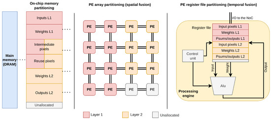 The goal of a mapping framework such as Timeloop [8] or CoSA [9] is to find an efficient mapping for the target spatial array. This involves searching for optimal spatial and temporal tiling and reordering as detailed in Section 3.3. Resource partitioning is conducted at the layer level to map the execution of a single workload in [8,9,11], whereas resource partitioning in this work occurs at both the layer and the CNN level to map the execution of multiple layers on a fraction of the available resources. In this work, we explore both array and register file partitioning. The former is similar to spatial tiling at the array level (unrolling, PE set), and the latter is similar to temporal tiling at the register file level (loop tiling). Figure 10 depicts the spatial and temporal fusion proposed in this work and detailed in the following paragraphs. Since the main focus is the analysis of inter-layer scheduling opportunities, an analysis of the required high-level and PE-level control is omitted.