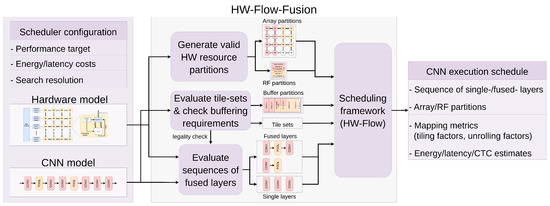 Convolutional neural networks (CNNs) are currently the state-of-the-art approach for many computer vision tasks, such as image recognition, object detection, and segmentation [1,2,3,4]. However, their superior task accuracy comes at the cost of high computational complexity and memory demands and makes deployment difficult on energy-constrained devices, such as autonomous electric vehicles and drones [5]. During the last decade, specialized CNN accelerators such as [6,7] have been developed to maximize the inference’s energy consumption and throughput by reducing the data movement required to process convolutional layers. These accelerators expose many reconfigurable hardware (HW) parameters to allow flexible resource mapping to execute many different workloads. Several design space exploration tools have been proposed to facilitate the evaluation of these architectures, and the search for optimal mappings [8,9,10,11]. These frameworks use scheduling techniques to map the computation of CNN workloads to the available hardware resources while optimizing the execution for different performance targets. The scheduling techniques typically used in the aforementioned frameworks are limited to intra-layer data reuse, i.e., each layer composing the CNN is mapped and optimized singularly. Each layer of a CNN, except for the first and last ones, is fed with the data produced by a preceding layer and generates new data that feeds the subsequent layer. The data between adjacent layers is usually stored outside the accelerator and read back again for processing since the volume of intermediate data is orders of magnitude higher than the available on-chip memory [5]. This data movement is redundant and could be avoided by scheduling the communication and computation of the accelerator in such a way that once data is produced from one layer, it is immediately reused by the next one. Previous works have proposed methods to leverage intermediate data between consecutive layers, referred to as layer fusion, to reduce the inference’s energy and latency, such as a specialized systolic array tailored around a specific CNN [12], graph rewriting for operation fusion for general purpose architectures [13], and dataflow mappers for throughput optimization [14].