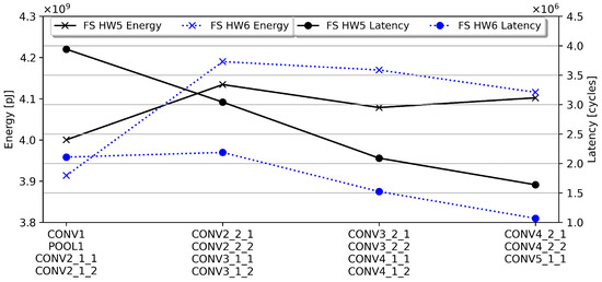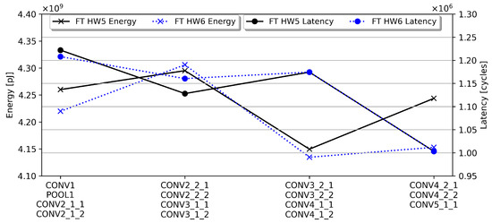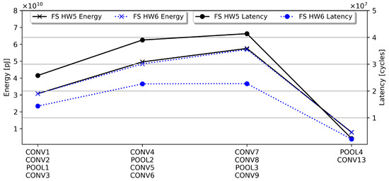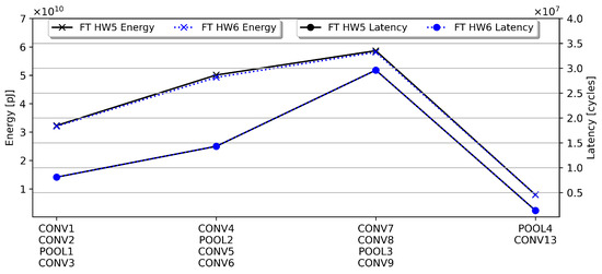 Energy and latency for VGG16, mapped with temporal fusion with HW config. 5 and 6.
