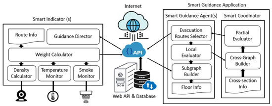 Figure 1 presents the architecture of the proposed emergency evacuation system. The system consists of three main modules: Smart Indicator(s), Smart Guidance Agent(s) (SGAs), and Smart Coordinator. In which, the Smart Indicators interact with Smart Guidance Agents via a Web API using the HTTP protocol. While Smart Guidance Agents work with Smart Coordinator in the same application, namely Smart Guidance Application. We describe more details about these modules as follows.