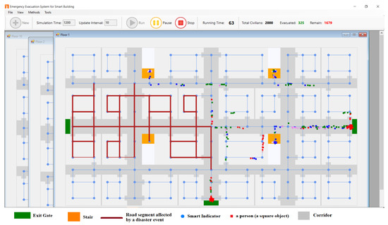 We simulate a synthetic building with ten-story (ten floors). Each has four stair gates and 187 smart indicators, and the first floor has three exit gates as shown in Figure 3. The area of each floor is approximately 8300 square meters. We simulate a fire event that affected a stair on the first floor as well as two exit gates and their close regions. We assign randomly trustiness values in the range [0.2, 0.8] for road segments affected by the fire event. We also simulate the fire spreading by randomly updating trusted values and expanding the affected regions. We generate 2000 objects simulating people in the building. The location of people is generated randomly near the locations of smart indicators. We choose the interval for updating the status of every smart indicator to be 10s. The moving step of people is updated every 200 ms.