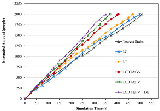 Figure 4 illustrates the comparison of the LCDT&PV approach and the LCDT&PV + DE approach with other baseline approaches. We found that the LCDT&PV approaches are more effective than others overall. Specifically, to guide all people passing through exit gates, the needed simulation times are 352 s, 371 s, 406 s, 468 s, 498 s, and 509 s corresponding to LCDT&PV + DE, LCDT&PV, LCDT&GV, LT, LC, and Nearest Stairs, respectively. Thus, our LCDT&PV approach can save approximately 8% to 25% of the total evacuation time compared to other baseline approaches. Meanwhile, the LCDT&PV + DE approach can improve 5% of the total evacuation time compared to the LCDT&PV basic approach.