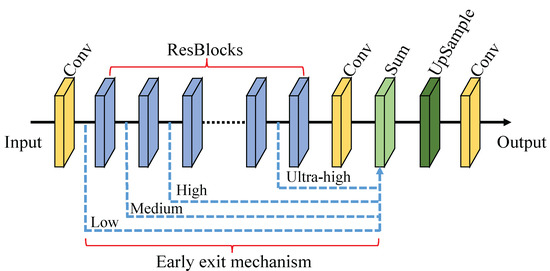 For a certain amount of computing power, the VSR processing time will partially depend on the scales of the VSR model. A more complex VSR model will cause a longer processing time and increase the end-to-end delay, but can gain a better quality of the reconstructed video chunks. Inspired by NAS [8], VSR pre-configures a network model for each possible . At the same time, in order to achieve a good tradeoff between the processing time and the video quality, we propose a multi-scale mechanism for each VSR model which consists of total ResBlocks [25]. The scalability of the VSR model can be implemented by regulating the output path of the early exit mechanism [25] (i.e., the number of ResBlocks used for inference). For example, the scale can be set as low, medium, high, and ultrahigh with different number of ResBlocks in the neural network as shown in Figure 2. However, it is worth noting that even a small number of ResBlocks are used to reconstruct low-resolution videos, and QoE can still be improved compared to watching the original low-resolution videos.
