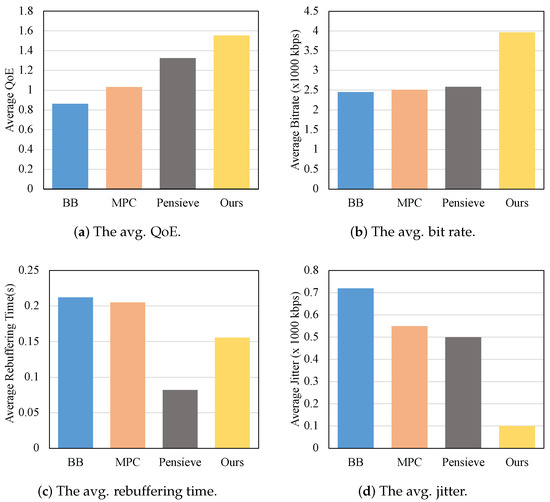 Furthermore, from Figure 4b, it can be observed that SR-Telemedicine can largely increase the average video bit rate compared to the baseline algorithms. This is due to VSR processing on the edge node. The proposed SR-Telemedicine system can provide video chunks with higher quality under the same network condition as that of the baseline algorithms. Even when the network condition is poor, SR-Telemedicine can still obtain low-resolution videos from the patient, which can be then reconstructed into high-resolution videos at the edge node by a VSR processor before sending it to the physician. However, the three baseline algorithms can only choose to deliver low-quality videos to the physician under poor network conditions.