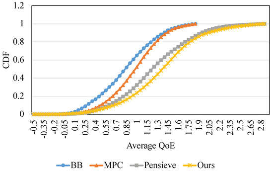 In addition, we conducted experiments to analyze the cumulative distribution function (CDF) of QoE for all employed algorithms in this paper. From Figure 5, we can see that our proposed SR-Telemedicine outperforms the baseline algorithms in the average QoE and can achieve a better QoE with a higher probability. At the same time, the maximum QoE that SR-Telemedicine can achieve is also better than other baseline algorithms. This performance gain mostly comes from the VSR processing on the edge node near the physician.