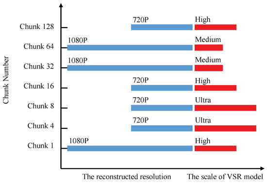In order to verify the validity and feasibility of the multi-scale VSR model, we recorded the reconstructed resolution level and the corresponding selected VSR model as illustrated in Figure 6. When SR-Telemedicine reconstructs the resolution of the video chunks from 240p to 720p or 1080p, it actually chooses different model scales to adapt to the time-varying computing resources. In this case, we may maintain a continuous and stable resolution level to reduce the video-quality jitter between adjacent video chunks even though the computational capability changed.