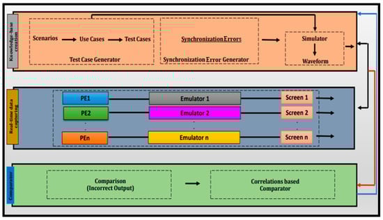 The knowledge base technique contains test cases, synchronization errors and the simulated waveform across these synchronization errors. Figure 3 depicts the knowledge base creation steps. First, we created a knowledge base that includes every conceivable and specified combination of synchronization-related errors that might arise in high-speed serial interfaces, as shown in Figure 2. Then, the proposed technique was used for localizing the synchronization errors by capturing the real-time data across multi PEs interfaces in a multiprocessor-based real-time embedded system using multiple emulators. Then, we compared the actual result of the real-time embedded system with the result stored in the knowledge base to find the correlations between them. The steps for the detection and localization of the errors are shown in Figure 4. Each emulator is connected with a different PE. So, if there are six PEs, it means that they connected with six different PCs using emulators.
