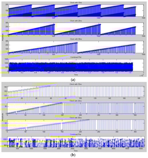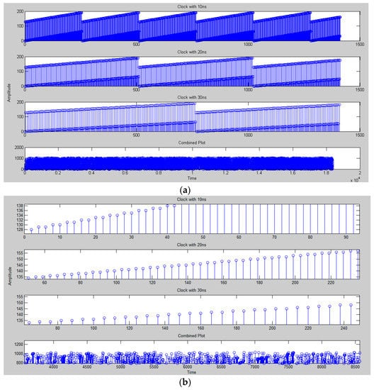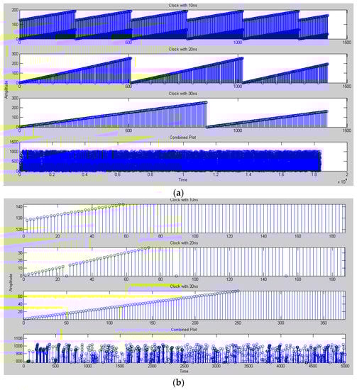 To test the multiple interfaces across multi PEs, we generated a ramp signal continuously and increased the ramp signal from 0 to 255 where the value of n in Equation (1) is 0 to 255. To produce all conceivable forms of the ramp, we reported in the article to observe how the shape of a ramp signal varies by inducing synchronization errors.