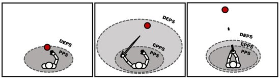 Further focusing on the issue of non-mediated vs. tool-mediated interaction mechanics, we consider some types of handheld tools, commonly used in VR games (e.g., swords, clubs, bats), to serve as significant extensions of peripersonal space, enabling the user to interact with objects that are positioned in what can be described as near extrapersonal space. Thus, while non-mediated interactions only allow the player to act within the physical boundaries defined by the dimensions of the player’s body and the limitations of tracked physical space, tool-mediated interactions increase the interactable area by a small margin, based on the length of the tool in question. However, in cases in which the virtual environment covers a broader area compared to the tracked physical space, target objects positioned further from the player may still remain physically unreachable. Obviously, this is not necessarily an issue—in fact, positioning target objects somewhere in the distant extrapersonal space can almost be considered a prerequisite for the implementation of certain game mechanics. For example, the ever popular shooter genre is inherently defined by tool-mediated interactions with distant targets. Furthermore, a significant percentage of sports—which are commonly emulated in VR games—are based on repeated and rule-governed actions that can be described as throwing, shooting, or hitting objects toward a distant target or targets. Therefore, we consider tool use and target positioning to be interconnected, both serving as key features based on which we choose to categorize different game mechanics. For the sake of simplicity, in this paper we will refer to peripersonal space (PPS) as the space in which the user is able to directly interact with objects without the use of external tools. We will refer to the space in which the user is able to physically interact with objects using handheld tools as extended peripersonal space (EPPS). The remaining area, which spreads beyond the boundaries of extended peripersonal space and is therefore not directly reachable, will be referred to as distant extrapersonal space (DEPS). A simplified illustration of these concepts is provided in Figure 1).