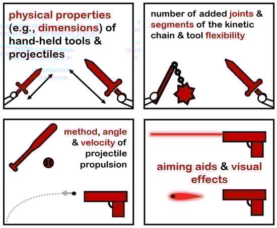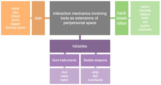 To better describe the notion of tools as extensions of peripersonal space, it is useful to refer to the concept of the body as a kinetic chain, comprised of rigid segments connected together with joints. Physical movements at the core of various sports activities are usually performed with the objective of optimizing acceleration and speed at the terminal segments of the kinetic chain [24,25] (e.g., foot in case of soccer, hand in case of volleyball). Hand-held controllers used with commercial VR equipment provide the system with an approximation of relevant terminal segments (i.e., hands) at any given moment. By providing the player with a hand-held tool, the virtual representation of terminal segments of the kinetic chain is being extended, either by modifying the size and shape of the original terminal segment, or by adding a new terminal segment, connected to the original terminal segment with a new joint. A sword attached at the end of a controller, fixed at a certain angle, but moving together with the controller as a single, rigid entity, connected to the rest of the chain by the wrist, serves as an example of the former approach. The latter approach is taken by Fletcher [26], who argues for the inclusion of an additional spring joint to separate the VR sword or other type of tool from the virtual representation of the controller, with the goal of presenting the player with a more convincing implementation of force feedback. While the implementation of interaction mechanics mediated by the use of swords, bats, and other types of rigid tools may include a single added joint, including a flexible tool (e.g., a chain, a flail) may even add multiple links to the original terminal segment of the kinetic chain. In addition to the fact that a hand-held tool extends the interactable space around the player to the extent afforded by its length, its dimensional and other physical properties determine its inertia and velocity profile in the context of the in-game physics system, contributing to the overall result and potentially affecting the overall perceived realism, utility and enjoyability of the game mechanics. Examples of different interaction mechanics and tools as extensions of peripersonal space are presented in Figure 2.