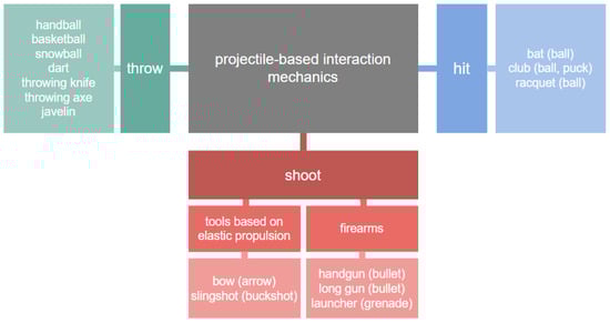 Whether talking about sports equipment or weapons, there is a common thread among tool-based interaction mechanics that involve targets primarily positioned in the distant extrapersonal space—their design usually relies on the implementation of projectile motion. A projectile is an object that has initially been propelled (launched) by a certain force, and is subsequently continuing to move along a certain path (i.e., the ballistic trajectory) under the influence of gravity and other external forces. While projectiles are very common in games, the gaming use case does not call for a high level of realism, meaning that projectile motion may be calculated based on simplified ballistic flight equations that often disregard the influence of forces such as air resistance and cross wind. A projectile does not necessarily need to be launched using a tool such as a gun or a bat—it may also be hand-thrown. Whether we choose to label this category of mechanics as tool-mediated is up for debate, as a projectile may be considered a tool in itself and often serves as an intermediary object that provides the means for the player to impact the target, but for the sake of simplicity we will refer to such cases as projectile-based non-mediated interaction mechanics, as to separate this type of mechanics from those that rely on a hand-held tool to propel the projectile. Examples of different projectile-based interaction mechanics are presented in Figure 3.