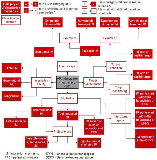 A diagram presenting a comprehensive overview of the interaction mechanics categorization discussed throughout this section is presented in Figure 4, which highlights different categories of VR interaction mechanics, as well as criteria used for their classification. After presenting the taxonomy, we further focus on dissecting each mechanic with the goal of defining the parameters that contribute to its quality. Thus, the following section outlines and defines specific factors related to the implementation of interaction mechanics relevant to consider in the context of UX design.