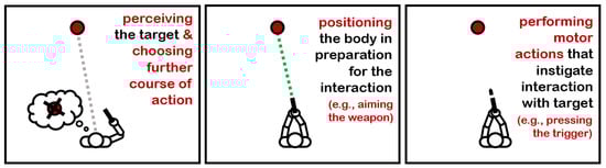 The process of performing core interaction mechanics (including the preparatory mechanics) consists of multiple stages (Figure 5), even in case of simple mechanics that do not require excessive strategizing or complex movements. After first perceiving the target (often preceded by active searching), the player chooses their subsequent action. In most cases, this includes multiple cognitive and motor operations necessary to aim, track, and interact with the target in some way, e.g., by touching it, picking it up, shooting at it, etc. Following the preparatory stages such as perceiving the target, as well as aiming and tracking, the player instigates the process of interacting with the target. The resulting contact with the target can be categorized as either instant (e.g., touching the target with a sword) or delayed (e.g., shooting an arrow and waiting for it to reach its destination), as well as discrete (e.g., bullet hits and immediately destroys the target object) or continuous (e.g., slicing through a large object).