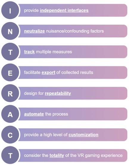 Following and expanding upon the principles described by the authors, we developed a framework for the implementation of a platform for the evaluation of VR interaction mechanics, presented under the acronym INTERACT (Figure 6). A more detailed description regarding each guideline in the INTERACT framework is presented below.