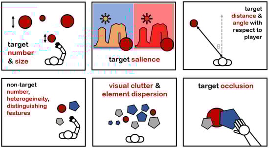 Targets are hardly ever the only elements in the environment. Their salience with respect to their surroundings is what makes them easier to spot, but what makes this more difficult is the presence of non-targets, or distractors. It is important to note the number of distractors, whether they differ from each other, and how much they differ from the target. Having a mix of targets and non-targets in the same environment may lead to visual clutter, but their number and their dispersion affects how difficult it is to find and access the target, especially if it is occluded by other objects. Figure 8 summarizes the aforementioned target-related parameters.
