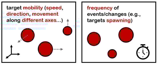 Depending on the game, a target may be completely passive and stationary (i.e., a stationary object), or it may be programmed with a specific behavior (e.g., enemies in a shooter game). While it is not feasible to attempt to list all possible properties of more complex behaviors in the scope of this paper, we focus on the most generic temporally variable features of target behavior. A target may move which may impact user experience to varying degrees, based on the speed and direction of movement, as well as whether it occurs along a single axis (e.g., a target only moves left to right) or multiple axes (e.g., a target may fly up and down, shift left to right, run toward or away from the player). Furthermore, the game may include target-related events—a target may spawn, or disappear with time, it may change the trajectory of its movement, etc. The frequency with which this happens may play a considerable role in player performance. These temporally variable target-related features are depicted in Figure 9.