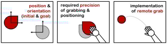 Because of the seemingly endless number of possible tasks across various games, we will not attempt to propose very specific task-related parameters. However, with pick-and-place as a basic interaction mechanics, we highlight the following (Figure 10): position and orientation of initial object placement, the goal position and orientation, and required precision of grabbing and positioning (i.e., the accuracy with which an object has to be picked up or placed in order for it to be accepted by the game as a successful attempt). To prevent the user from strenuous movement, many games include the “remote grab” option, providing the player with the opportunity to access distant objects, which extends the interaction space from peripersonal to extrapersonal, decreases the challenge of obtaining distant objects, while potentially increasing player comfort.