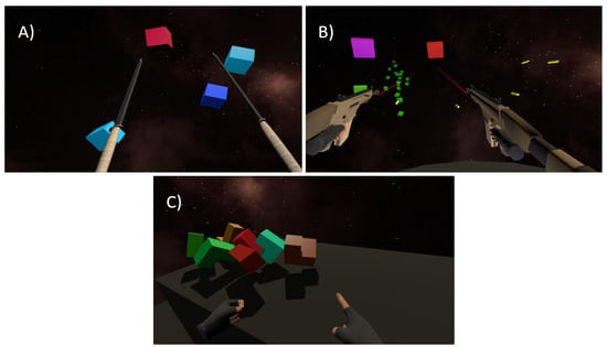 Screenshots from a prototype implementation of our test application concept depicting different VR interaction mechanics: (A) slice; (B) shoot; (C) pick and place.