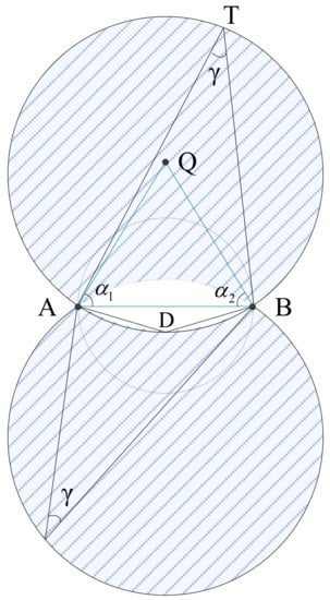 Suppose: the distance between Platforms A and B is D; the antennas point at active target T, shown in Figure 2. The angle of direction and . Then, the distance between the target and the two targets is, respectively: and . The resolution cell, precision of localization and non-synchronous errors are all related to the intersection angle of the two platforms’ antennas, . In addition, when , the values are minimal; when , the values are infinitely great. Hence, must be controlled within a certain range so as to achieve tactical goals. Generally, the cooperative localization zone is valid when . In direction localization, in the circle with the diameter , any intersection angle formed by the intersection points of the two platforms is Then, the circle is regarded as the optimal intersection circle. The track formed by the points with the intersection angle is a circle with AB as the chord. The opposite angle of the cyclic quadrilateral is complementary, reaching . Similarly, the same circle can be formed below AB. The “XOR” zone of the two circles is correctly the coordinative localization zone that meets the condition, . The central point of the localization zone, Q forms an equilateral triangle with A and B.