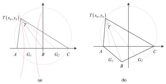 If A, B and C form a triangle, is the tangent line of AB and the bisector of , while is the tangent line of BC and the bisector of , shown in Figure 3b. The intersection angle of is the intersection angle of the hyperbolic curve. When is a constant value, the localization zone of ABC is still a circle with AC as the chord. The coordinate of the circle center is ; radius . The localization zone is restricted by , i.e., related to B’s location. It will be discussed below.