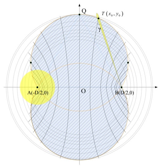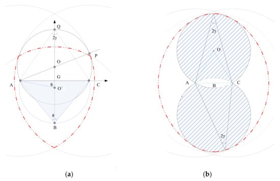 Based on the above analysis of shape of time difference localization zone, the optimal platform layout in time difference localization can be summarized as “triangle layout”. Suppose: the maximal distance of passive perception between Platforms A and B is . Cooperative time difference localization is applied to conduct cooperative detection within the designated target zone (the radius of the circumcircle is ,). The optimal airspace of the platforms’ movement can be confirmed according to the target zone. The steps are as follows: