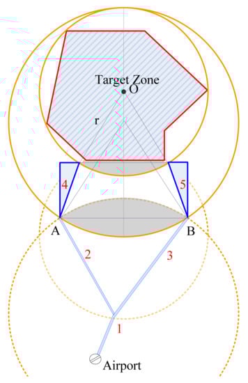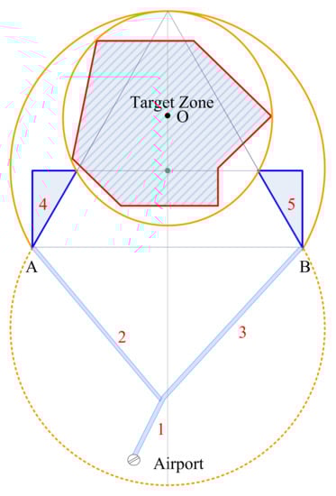 - Connect two triangles’ base angles, shown in Figure 8 to get the optimal movement airspace of Platforms A and B (Airspaces 4 and 5). Distance of the base line: ;