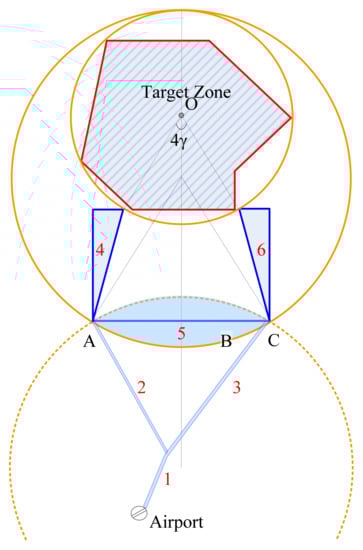 - Connect two triangles’ base angles, shown in Figure 7 to get the optimal movement airspace of Platforms A and C (Airspaces 4 and 6). The zone circled by curve with AC as the chord is B’s movement zone (Airspace 5); distance of the base line: ;