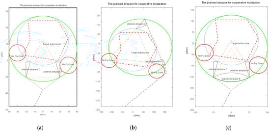 Each transducer’s maximal detection range, Rmax, is 80 km. The “no fly zone” is shown in red solid line in the figure. According to the above algorithm of cooperative localization platforms’ planned airspace, the optimal airspace planning of the three localization methods is as below so as to minimize the following performance indexes: