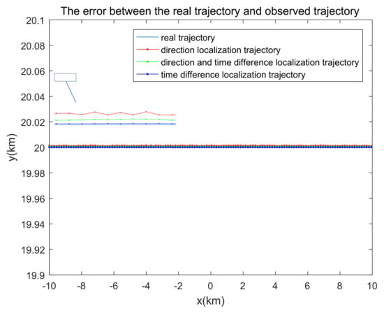 Based on the observation results of Platforms A and B or A, B and C, the target’s track is solved, as shown in Figure 13. Each localization platform sends the observation data every 3 s, i.e., the target’s location at the time of observation. The light blue line is the actual track; the red line is the track observed by the localization platform; the green line is the target’s track observed by the direction and time difference localization platform; the dark blue line is the target’s track observed by the time difference localization platform. The errors of the tracks concluded by different cooperative localization approaches are shown in Table 1.