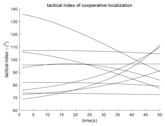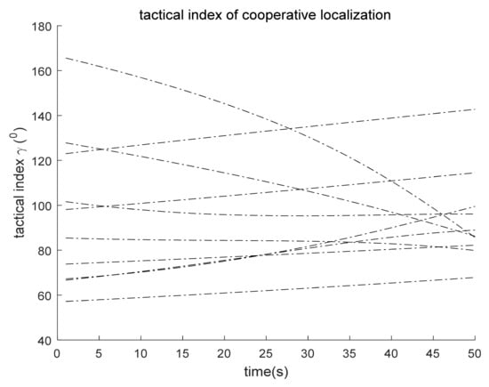 In order to verify whether the intersection angle between the target and localization platform can achieve tactical goals, 10 random tracks are formed in the target action zone to calculate the intersection angle between the detection platform and the target (Figure 15, Figure 16 and Figure 17) as well as verify whether tactical goals can be achieved by simulation, as stated in 2.1–2.3. The target’s track is shown in a red solid line in Figure 8, which respectively reveals the tactical requirements on the target and direction localization platform, and the corresponding observation angles, as defined in part 2.