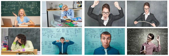 Many previous researchers have worked on the present technique for developing emotion recognition hardware on image/pattern recognition systems [38,39]. Further, an important point that must be focused on, according to experts, is that communication with body language must be reciprocal. Students express themselves through their movements more than through speaking, and they sometimes may not dare to speak, but they express themselves through their behavior more, and the teacher must understand these movements and nonverbal signals to help with student engagement. Figure 1 illustrates a sample of teachers’ emotions in the classroom.