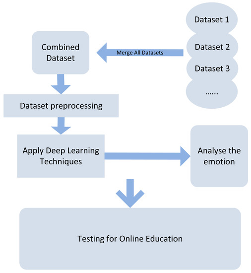 Several datasets have been used in the proposed system; some are collected from the web, and others have been previously implemented by other researchers (more information about the dataset will be explained in detail in the next section). The proposed system employs deep learning techniques to test the emotions in the dataset after applying preprocessing stages to reduce the features and remove noise. Figure 2 illustrates the proposed system implemented to analyze teacher and student emotions.