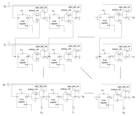 In image processing, median filters are often used to remove the impulse noise [13]. However, if the probability of impulse noise becomes high, a standard median filter with a window size of either , , , or is used depending on the percentage (%) of noise [14]. Since the amount of noise is random and unknown a priori in adaptive median filters, the window size is chosen dynamically or at run-time [15]. For further details of the adaptive median filters, we refer to [13,15]. In such adaptive filters, pixel buffers are often needed in the hardware, cf. Figure 2. In this pixel buffer of —arranged in a 2-D matrix style—each element is an 8-bit D-type register (flip-flop) storing the neighborhood of all the window sizes. The filtering algorithm can adaptively choose a window size, calculate the median and determine whether a center pixel is noisy or not, and replace it if needed. Pixel buffer supports raster scanning of the image where 9 pixels per clock can enter it either from right or left , controlled by a multiplexer with a control signal, right_left_ctrl, see Figure 2. To maximize the reuse of the pixels present in the buffer, at both column ends of an image, the pixel values are shifted in a bottom-up fashion. Here, the new pixels enter from the bottom , controlled by a multiplexer with a control signal (bottom_ctrl). To summarize, the pixel buffer consists of 8-bit shift registers in a matrix form, supporting right, left, and bottom-up data movement.