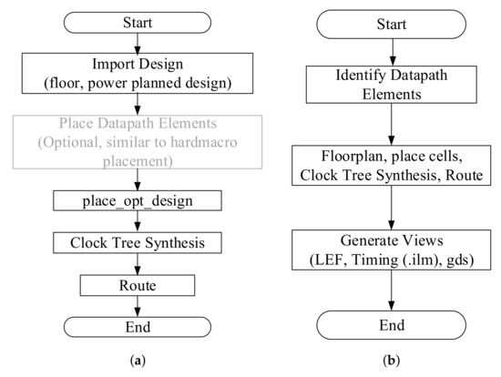 The structured data-paths are regular in their structure, and their careful placement is essential for obtaining a good quality layout. Chou et al. in [1] present an algorithm that can exploit the regular structures in the design, i.e., it can extract them and place them appropriately to minimize the wire length, etc. In [2], Ye et al. talk about capturing data-path bit-sliced structures using Abstract Physical Model (APM), which can be extracted from the data flow graph. This APM can be further used for interconnect and congestion planning. This methodology was implemented in C++ and benchmark data-path circuits, which is an FIR filter. In [3], Nijssen et al. present an algorithm for the automatic extraction of regular structures from the logic netlist of data-paths for better placement. In [4], Ward et al. discuss extracting data-paths using a novel data learning technique and a new placement algorithm. In [5], Serdar et al. present a design flow for automatic data-path placement using simulated annealing and a global placement flow based on the o-tree algorithm. Liew et al. in [6] proposed a manual placement algorithm for handling SDP elements using Integrated Circuit Compiler I (ICC I) from Synopsys. In their approach, from the initial ICC placement, structured registers, including their connections, are extracted to form RP (Relative Placement) groups. Later, these extracted RP groups were placed manually using an algorithm named SDP-RP using ICC I. Synopsys also introduced ICC II, which has an SDP flow similar to Cadence’s Innovus SDP flow. In [7], Henrik et al. used ICC II SDP flow for a synthesizable register file design. He also extracted the SDP structures from the design using script named pyplace and generated the relative placement file as per the syntax of ICC II. However, the results of the SDP flow of ICC II were not as good as the normal flow of ICC II, where the tool does everything, i.e., no manual intervention. We presume that the relative placement file did not capture all the SDP elements leading to poor results. Sabyasachi et al. in [8] presented a methodology for detailed routing of data-path connections that are regular in nature. Similarly, structured nets across various bit-slices are identified as net clusters. For each representative net of the cluster, an optimal route was identified first, and the same routing was inferred for the rest of the nets. This approach results in more regular connections, and since only a few nets are routed, it will also result in significant speedup. In [9], Sotiriou et al. presented two algorithms named Greedy and Isomorphism to extract SDP clusters from synthesized gate-level netlists. In the same paper, they also presented an SDP placement algorithm—compatible with commercial tools—to place the extracted SDP clusters. Currently, the most widely used tools ICC and Innovus from Synopsys and Cadence, respectively, support the SDP flow. However, these tools do not extract the SDP elements automatically and place them. Though there are many algorithms proposed to extract data-path elements automatically in [1,2,3,4,5,6], design knowledge is essential to extract the data-path structures and place them; therefore, none of the commercial tools have automatic data-path extraction in their flow. Therefore, extracting the SDP elements is an essential step in custom placement of them. Our work in this paper extracts the SDP elements in the design using scripts based on the design knowledge and the structure of the generated netlist. Furthermore, we evaluate the SDP flow of Innovus and present a methodology for achieving optimal results. To the best of our knowledge, this is the first work to try and evaluate the SDP flow of Innovus.