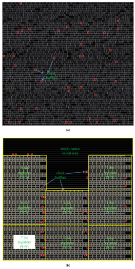 Figure 8b shows the layout of the PB design with the placement of data-path structures using the RPF. As aforementioned, a similar structure exists for each bit of the registers in the design, as shown in Figure 2. Each such structure can be placed regularly, as shown in Figure 8b; the numbers in the yellow boxes denote the bit positions. Figure 8a shows the layout of the PB design using normal flow. Table 2 compares various performance metrics for normal and the SDP flow using the same core area. For the PB design, the SDP flow results were better since the RPF file was complete, i.e., all the needed bit-sliced information was captured. It can be observed that SDP flow has 17% less density compared with the normal flow; see the empty space in Figure 8b. In normal flow, the instances were placed all over the core area, see Figure 8a. Figure 9a,b show the clock tree network for the normal and SDP flow, respectively. In both cases, the clock has straight routes; however, in the SDP flow, the clock net length or total wire length was less, resulting in slightly lower power consumption. Timing in the SDP flow was slightly degraded; however, the use/density and other metrics were lower for the SDP flow. SDP flow is present in both Cadence’s Innovus and Synopsys’ ICC II; however, it is still not a part of the standard design flow because its quality of results depends on effective data-path extraction, for which there are no deterministic algorithms. Therefore, to avail of the benefits of the SDP flow, design knowledge is essential to extract the data-path components for optimal placement using an RPF.