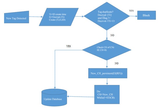 Algorithm 2 denotes the cluster head failure and detection of tag duplication. While creating the tags, some attributes have been loaded into the tags’ memory, such as tag creation time (Ti), encryption of tag (Ei), and tag id (ID). To detect tag duplication, it will consider only the encryption of tag (Ei) time and creation time (Ti). If both are equal, the detected tag will be recognized for further consideration. Otherwise, it will be treated as a duplicate. Furthermore, if there is no response from the CH of the CNi, it is treated as CH failure. The network has to react immediately to choose another node as CH. The energy level (El) of the new node will be compared with other nodes, and if the suggested node’s energy level is higher than others, it will decide as CH. The checking should continue till the end of cluster boundary (EOCB).
