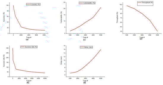 Accuracy represents the efficiency of the network by identifying how many reader tag communications are successful; that percentage is denoted as the accuracy of the network. In our research, the below Equation (7) is used to calculate the accuracy.