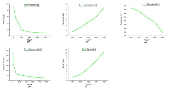 (a) Accuracy of Clustered RFID (b) Success rate of Clustered RFID (c) Vulnerability of Clustered RFID (d) Delay of Clustered RFID (e) Throughput of Clustered RFID.