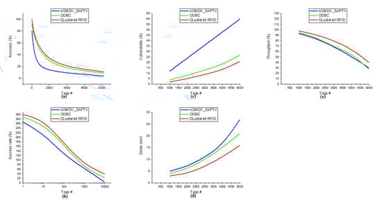 In Figure 5, the examination investigation between Clustered RFID, AOMDV_SAPTV, and ODBC can be addressed. The curves plainly show that the Clustered RFID is contrasted, and the other advances are dependent on the system’s administration and are ascribed to the clustering component of the area ID of an article. From Figure 5, Clustered RFID is more proficient than the other innovations. The correlation investigation comprises accuracy (Figure 5a), success rate (Figure 5b), vulnerability (Figure 5c), delay (Figure 5d), and throughput (Figure 5e). In all the essential organizations ascribed, Clustered RFID is demonstrated to have better execution for area distinguishing proof of objects.