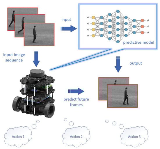 The so-called video-frame prediction task involves predicting the future of a visual frame based on the given contextual frames. From the perspective of applications, being able to predict the future is of great significance. Adaptive systems that can predict how future scenes may unfold based on an internal model that can learn from context will offer numerous possibilities.For example, a predictive ability would enable robots to foresee the future and even to understand humans’ intentions by analyzing their movements, actions, etc., to perform correct actions ahead of time (Figure 1). Self-driving cars can anticipate forthcoming situations and make judgments beforehand []. Moreover, there are a number of applications for this ability, such as anticipating activities and events [], long-term planning, the prediction of pedestrian trajectories in traffic [], precipitation forecasting [] and so on. With the predictive ability, applications can become more efficient, they can foresee a changing future and react accordingly in advance, making their behavior smoother and more energy-efficient. In different domains, the methods used may have some subtle differences (for instance, in the field of autonomous driving, the scene may be more complex, and a larger and deeper neural network, or other effective preprocessing or post-processing methods may be required), but the overall framework of the model should be unchanged.