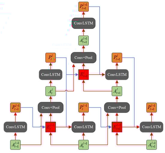In this work, we mainly referred to the design concept of PredNet [] when building the network structure. As early as 2016, Lotter et al. proposed such a typical predictive coding model, which strictly follows the dual-way flow at every time-step and which has achieved outstanding performance. Nevertheless, the processing of information can be improved in at least two aspects.
