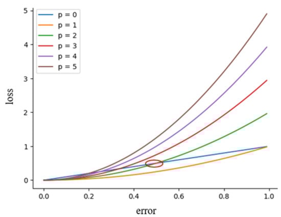 The relationship between the hyper-parameter p and the loss, where indicates that no weight is added, and the original error is directly used as the loss value. The red circle marks the threshold between and , indicating that when , more attention is paid to errors larger than the current threshold, whereas less attention is paid to errors smaller than the threshold.
