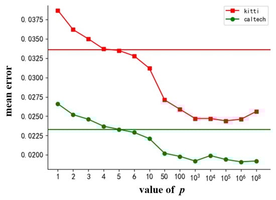In order to select a suitable value for the hyper-parameter p, as proposed previously, we performed two sets of experiments using part of the KITTI dataset and the Caltech Pedestrian dataset to explore its influence. The results are shown in Figure 6. The horizontal lines indicate the results obtained without adding any weight. According to Equations (2) and (4), when the value of p was set to 1, the loss function was equivalent to the mean square error loss. Obviously, the method of dividing the error into positive error and negative error was indeed beneficial. Better results could be observed when the value ofp was greater than five (or six) compared to those obtained without any weighting. The training loss (mean error) decreased with the increase inp, and we obtained a result close to the best result when its value was close to However, continuing to increase its value may have resulted in the opposite performance. Therefore, we chose a value around for the subsequent experiments.
