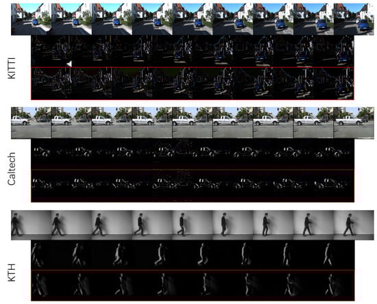 Visualization of variations between frames in each dataset. In each group, the first row indicates the raw frames, the second row indicates positive variations and the last row denotes negative variations.