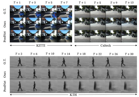 Figure 9 visualizes the long-term predictions for each dataset with different predicted time steps, respectively. In general, our results were better than those of PredNet. First, it can be seen in the figure that the inter-frame variations of the KITTI dataset were much larger than those of the other two datasets, and both PPNet and PredNet made fuzzy predictions for this dataset. However, PPNet could still make better predictions in the first few steps, whereas PredNet made blurry predictions and then merely reproduced them. This kind of replication is more obvious when using the Caltech dataset for evaluation. Though generating clearer frames compared to our method, PredNet merely reproduced previous frames, instead of making predictions. On the contrary, PPNet was still able to capture the motion information in the input sequences and make authentic predictions. PredNet captured the motion information on the KTH dataset eventually, but it learned only the person’s direction and their approximated speed, whereas other subtle movements, such as the actions of the person’s arm and leg, were lost.