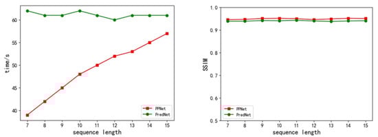 A set of priors is often already active on a higher level of the cognitive hierarchy, poised to impact the processing of new sensory inputs without further delay when contextual information has been put in place.Similarly, there is a delay in the upward flow of information at the beginning, but this disappears once the information reaches the highest level in our model, which may result in a trivial reduction of the computational cost when the input sequence is long enough. However, long sequences are not required. LSTM networks may capture spurious long-term dependencies that may have been present in the training data, hence learning inadequate causal models []. Additionally, we performed a set of experiments on both PPNet and PredNet, processing the same data into sequences with different lengths to prove our point (note that the total number of video frames was constant). As shown in Figure 10, the length of the input sequence had little effect on the prediction accuracy, but less time was required when using a shorter sequence in our proposed PPNet. Therefore, we can process the data into shorter sequences during training to reduce the consumption of resources and achieve sustainable artificial intelligence.
