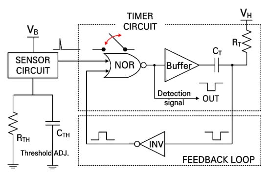 Maxwell’s conventional detection circuit [] for the protection of electronic devices from pulsed radiation is composed of a sensor circuit, an amplifier, a timer circuit, and an output sub block, as shown in Figure 1a. The radiation detection sensor of the sensor circuit typically consists of a PIN photodiode and generates a photocurrent when pulsed radiation is applied. The generated photocurrent is converted to a voltage, and a detection signal is outputted if the voltage is above the reference voltage. Furthermore, the detection sensitivity can be adjusted by using a resistor and capacitor (RTH, CTH) in the sensor circuit, and the pulse width of the detecting signal can be adjusted by the value of CT. The conventional detection circuit [,] has a response time delay problem from the sensor input to the output because it generates an output signal through a series of sensors, amplifier, and a timer block. To resolve this problem, the timer circuit was configured in parallel with the amplifier circuit in the timer bypass detection circuit (see Figure 1b), thus enabling fast output of the detection signal and simplification of the structure. The conventional detection circuit and the timer bypass detection circuit were designed as an integrated circuit at a power supply voltage of 3.3 V based on 0.18 um CMOS to compare the signal processing speed at the same conditions.