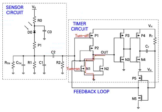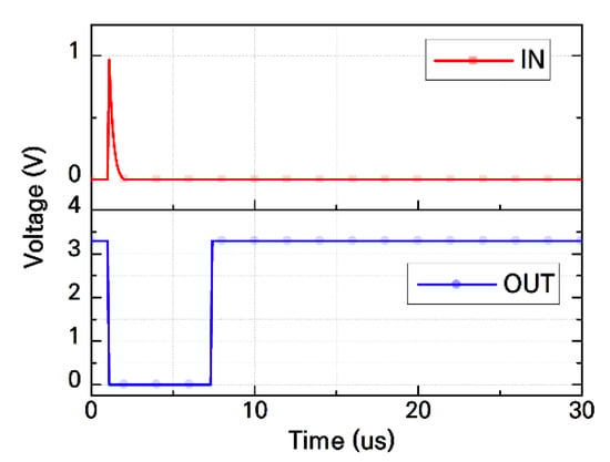 Figure 3 shows a detailed circuit diagram of the proposed detection circuit. The sensor circuit is composed of a PIN diode, resistors, and capacitors. When pulsed radiation is incident on the PIN diode, a photocurrent is generated. After the generated photocurrent is converted to a voltage through the resistors, signals are transmitted to the timer circuit through a differential circuit composed of capacitors and resistors. The detectable voltage level can be adjusted using the RTH and CTH values. The timer circuit is composed of a NOR gate and an inverter of the feedback loop, and is connected to CT and RT, which controls the detection time. It is operated by receiving an input from the sensor circuit, and the output of the sensor circuit is connected to the input of the n-MOSFET (N1) and p-MOSFET (P1) of the NOR gate. In the initial state, the NMOS connected to the ground is off, and the PMOS connected to VH is on; thus, the OUT is kept high. When pulsed radiation is applied and the output of the sensor circuit exceeds the threshold voltage of the input N1 of NOR, N1 is turned on and P1 is turned off.