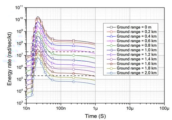 Simulation result of energy rate (rad/sec/kt) accumulated in Si sensor according to distance and time by prompt gamma rays (HOB is 503 m [] and the sensor is located 1 m above the ground).